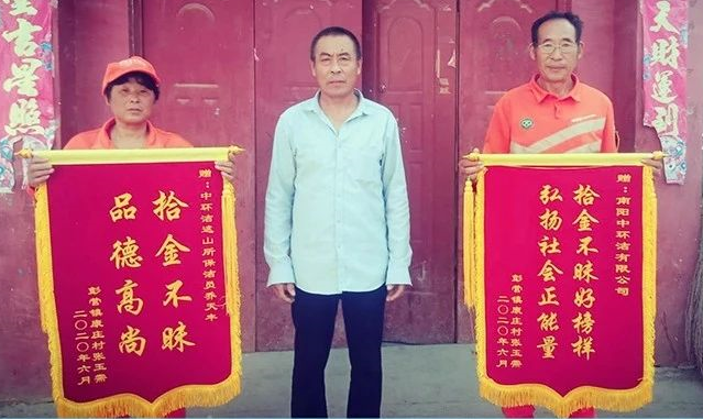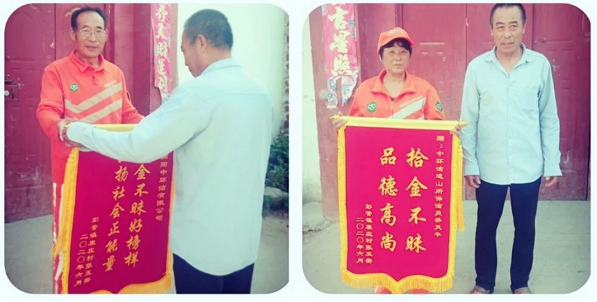 用專業(yè)守護(hù)環(huán)境,用真誠(chéng)守護(hù)美好。近日,鎮(zhèn)平縣遮山鎮(zhèn)的一位村民帶著兩面分別印有“拾金不昧,品德高尚”、“拾金不昧好榜樣,弘揚(yáng)社會(huì)正能量”的錦旗到南陽(yáng)中環(huán)潔遮山掃保所尋找環(huán)衛(wèi)工人喬天豐,要向他及南陽(yáng)中環(huán)潔公司致謝。